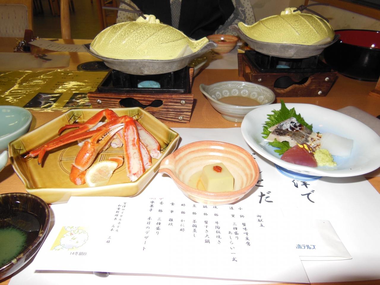 夕食はカニ鍋でそのほかにもいろいろあり おいしくて満足できた。部屋も広いし値段の割にはよいホテルだと思う。大浴場 露天風呂もよかった。