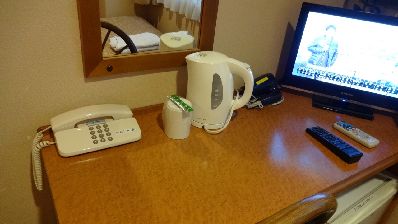 テレビはORIONというメーカー。湯沸かしポットはDRETEC。