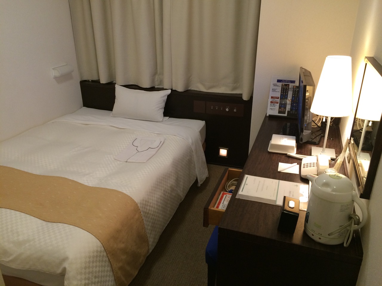 部屋の広さも小さめなキャリーバックも十分に広げられるスペースがあり、ベッドはダブルサイズで広々。