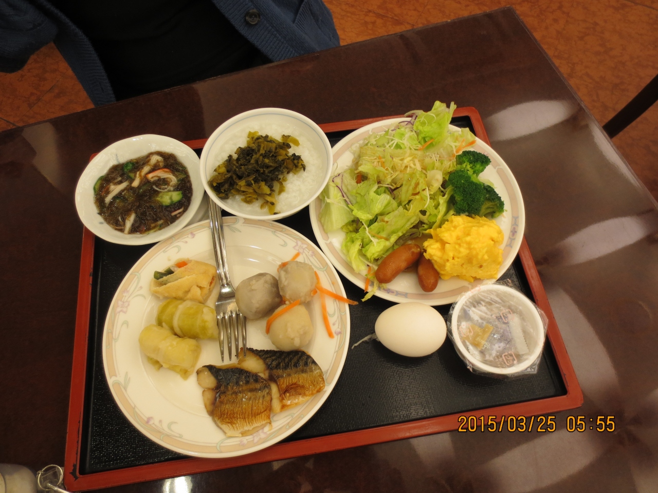 朝食のバイキングですが、品数は多くはありませんでしたが、家庭の朝食のような温かみのある食事でとても良かったです。もずくの酢の物、スクランブルエッグ、ウインナー、スパゲティサラダ、焼き鯖、生野菜サラダ、里芋の煮つけ等があり、特に金沢おでんがおいしかったです。