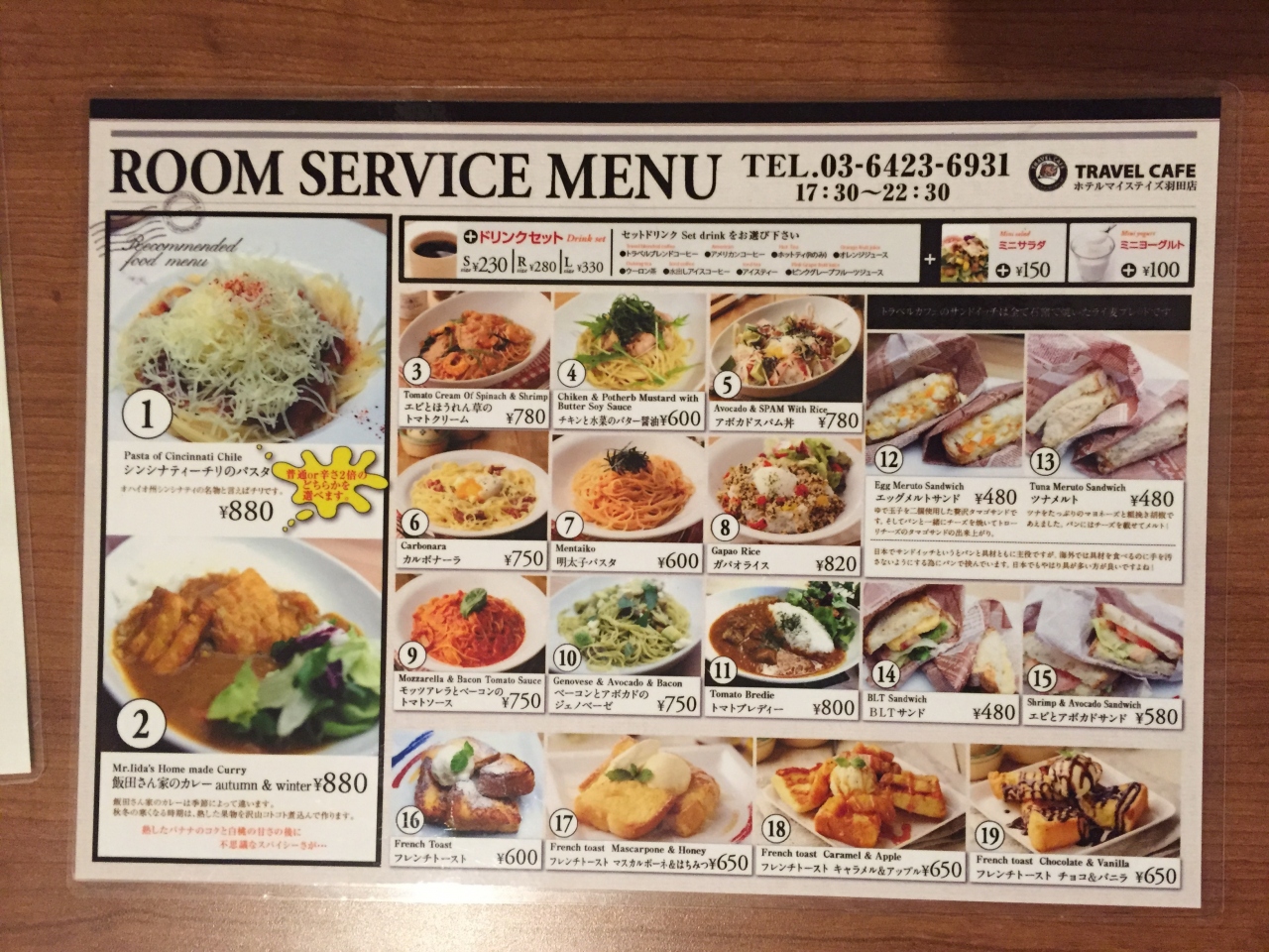 食事のルームサービスがありますが、1階のレストランで作られるからか、かなりリーズナブルです。