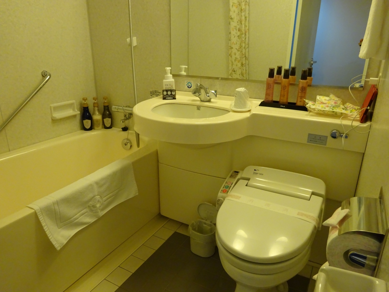 女性専用の部屋(?)だったのか、浴室のカーテン、トイレットペーパー等は花柄でタオルはバラ(?)の型押しがしてありました。浴室は滑り止めが貼ってありますが、浴槽は普通に滑ります。メイク落とし、化粧水、乳液も備えてありました。朝食を食べるところは和食屋で靴を脱がねばなりません。面倒くさ~い。部屋はWi-Fiでなく有線ランです。