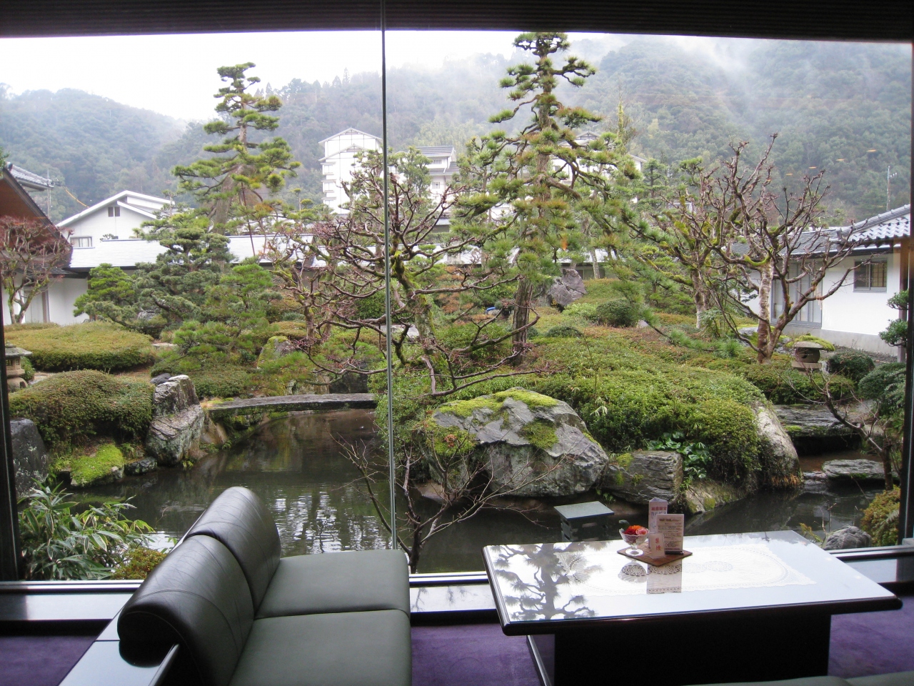 旅館の玄関に入ってロビーから見渡した「日本庭園」は、美しく手入れされ素敵です。