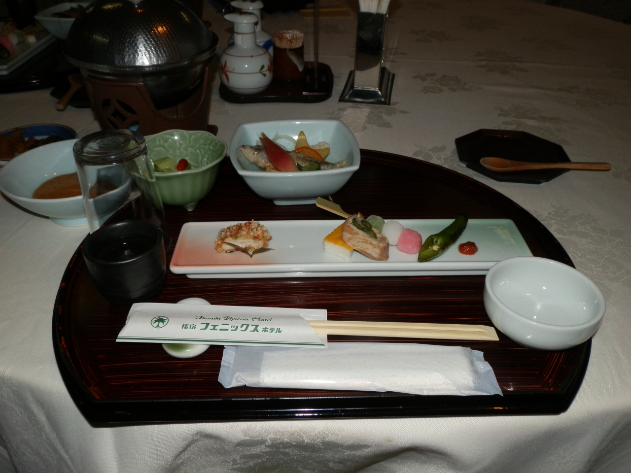 夕食はレストランで懐石料理である。昨今、夕食までバイキングが多いが、ここは落ち着いて食事が出来た。また、研修生がいるせいか、係の人が妙に多く、滞りなく料理が運ばれて来た。特にお造りは新鮮で美味しかった。