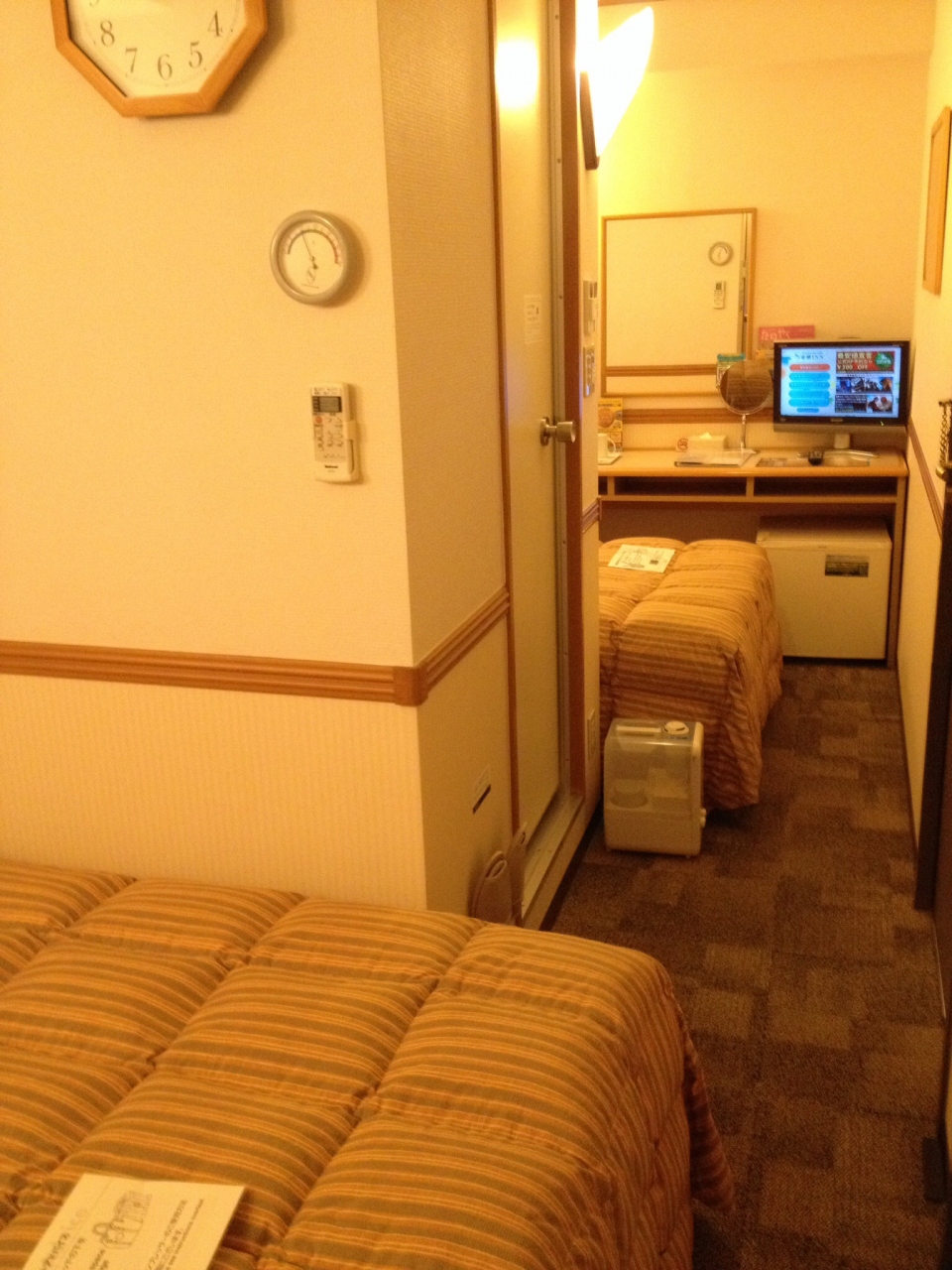 ツインしか空いておらず、安かったのでツインルームを選択しました。ドアを開けると、目の前にバスルームが。。。ん?バスルームを隔てて左右にベッドが置いてあるのではありませんか!?このような部屋は初めて見ましたが、面白い造りだなぁ・・・と思いつつ、どんな人が泊まるんだろう・・・と思いつつ、片方を使用させて頂きました。