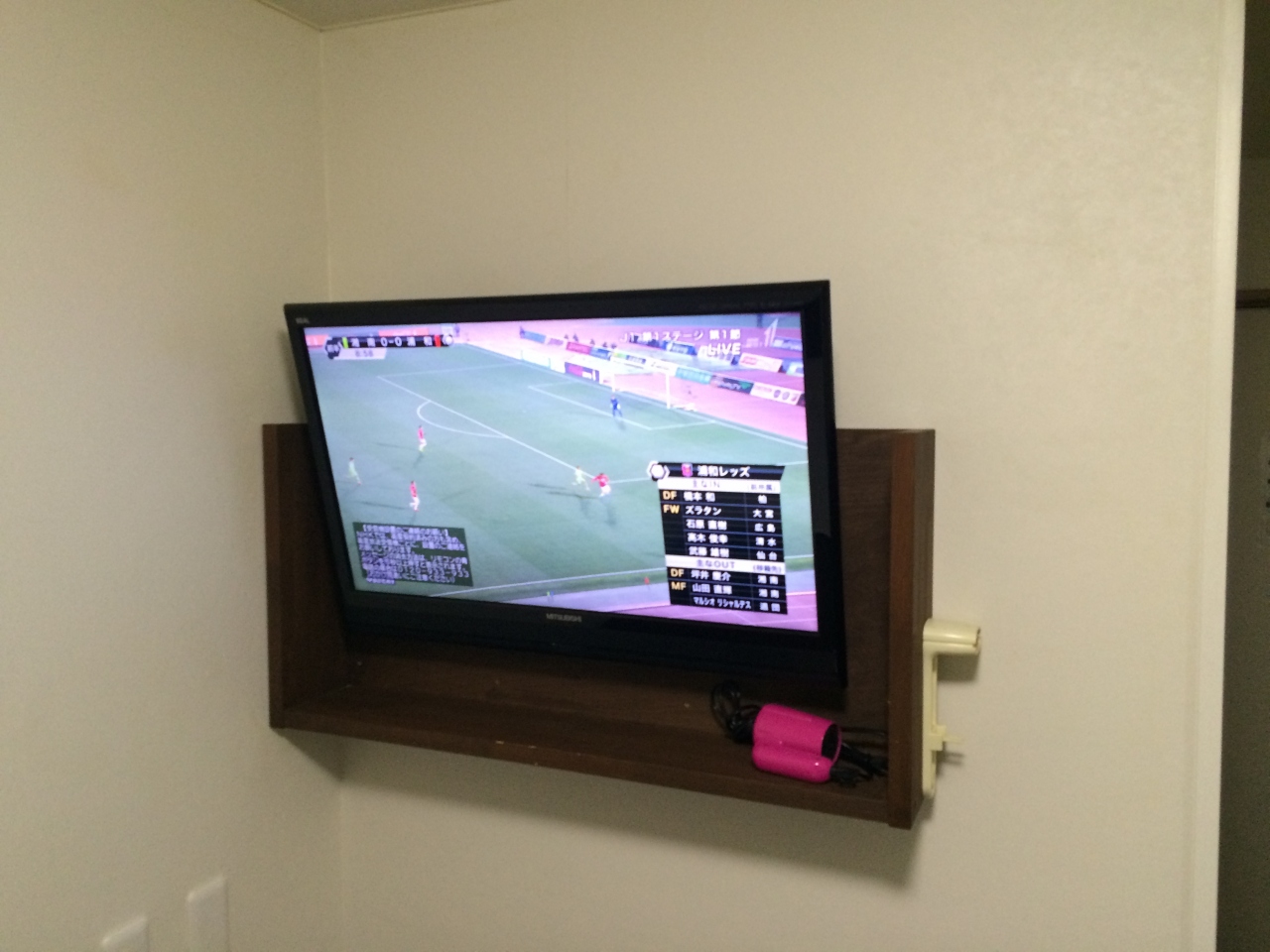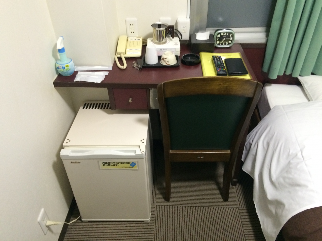 部屋に入ると、ベッド周りは落ち着いた色合いで、くつろげる印象です。目立つのは何と言ってもテレビで、32インチの液晶テレビがベッド前の壁に吊られています。寝転がって見るにはちょうどよい角度でペイチャンネルも無料で視聴できるのは好ポイントです。部屋自体は狭めですが、冷蔵庫も付いていて事欠かさない感じです。