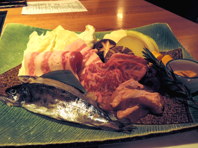 夕食は、17時半か20時の二部制になっています。コース料理で時間がかかるというクチコミが多かったので、覚悟はしていましたが、20時スタートだったのか、お客さんも少なくて、スムーズに料理が運ばれて来ました。狩人焼のコースでしたが、量は多すぎず少なすぎずで、その後の夜泣きそばも入るぐらいでした。