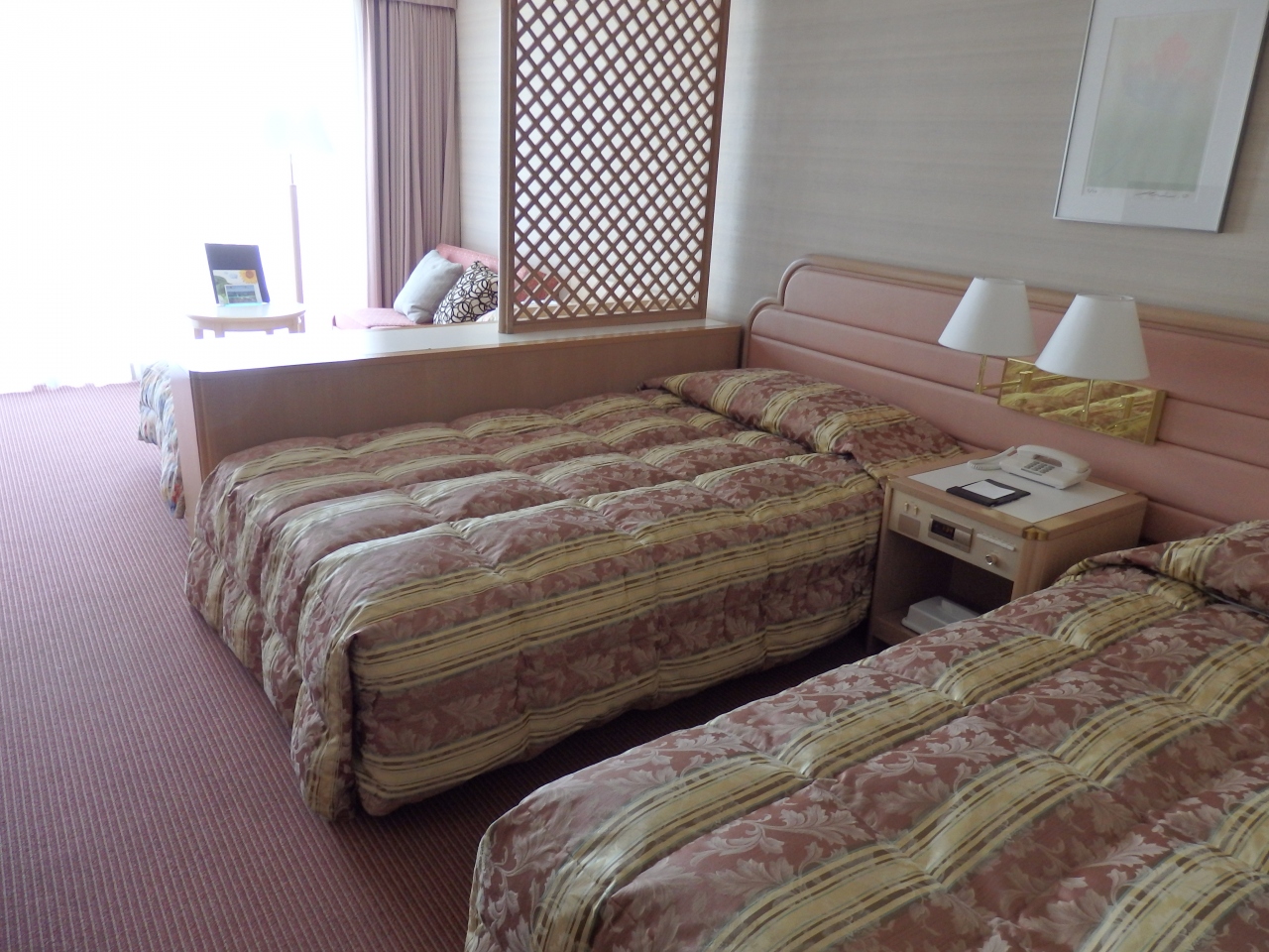 今回は、エクシブ伊豆1号館3階でした。ロビー階です。上層階だと眺望は良いのですが、下層階なので、今回は眺望はダメでした。ただ、洋室の中ではチョット広い部屋でした。廊下の音がもっとするかなと思いましたが、以外と静かでした。