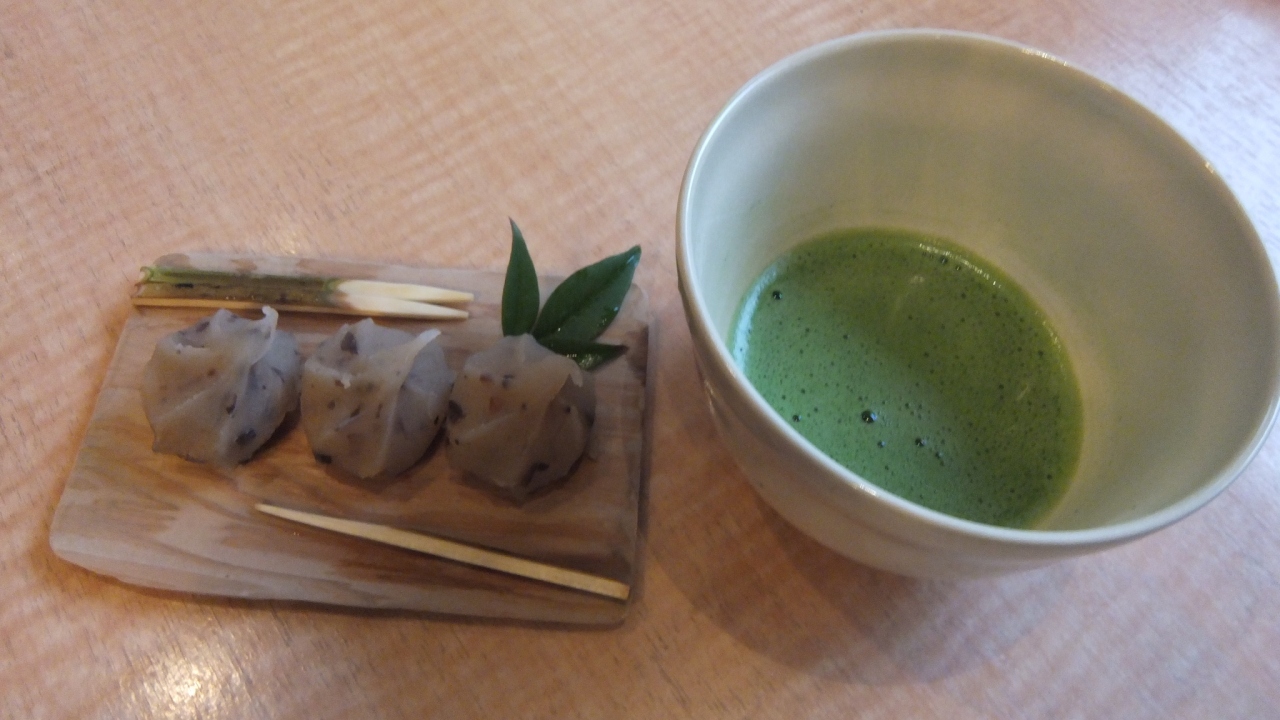 旅館に着いた時に出していただいたお抹茶と「黒豆とち餅」が美味しかったですよ。(笑)
