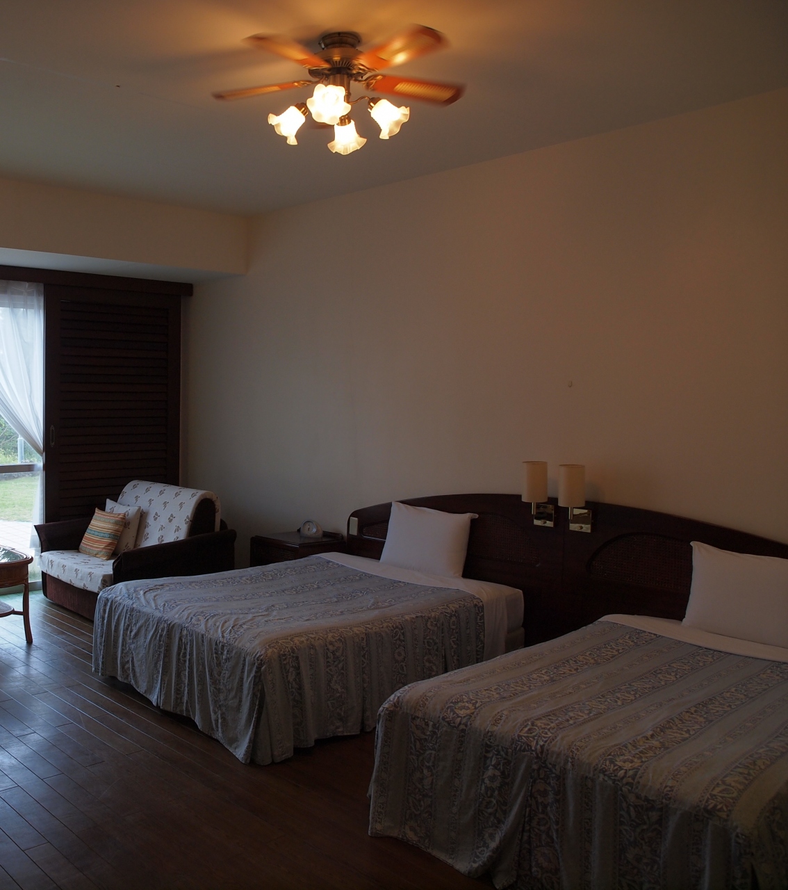 部屋は平屋でかなり広く、キングサイズ?のベッドが2つ並んでいても充分に余裕があった。夜に「チッチッチッ…」と鳴くヤモリも室内に棲息しているかもしれないけど、それも南国ならではということでそっとしておいてやってね^^。