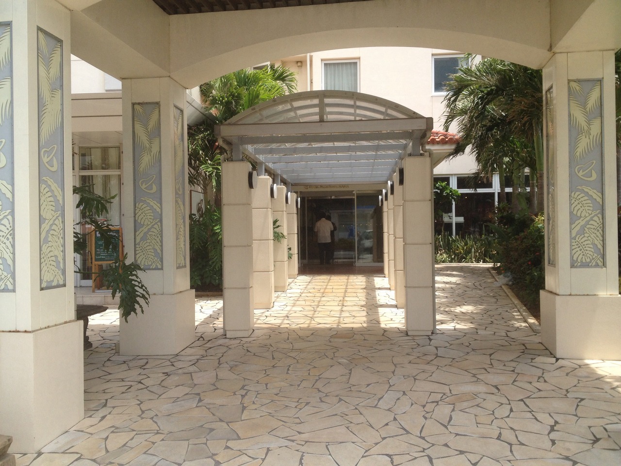 ホテル入口が5mほどですが、瓦の門柱になっていて南国雰囲気があります。庭周りも軽くガーデニングされています。フロントはそれほど広くなく3組程度が同時チェックインしてしまうと以降の組がフロント外にはみ出るくらいなのでかなり狭いです。集合は何時にフロントねって感じはしにくいかもです。