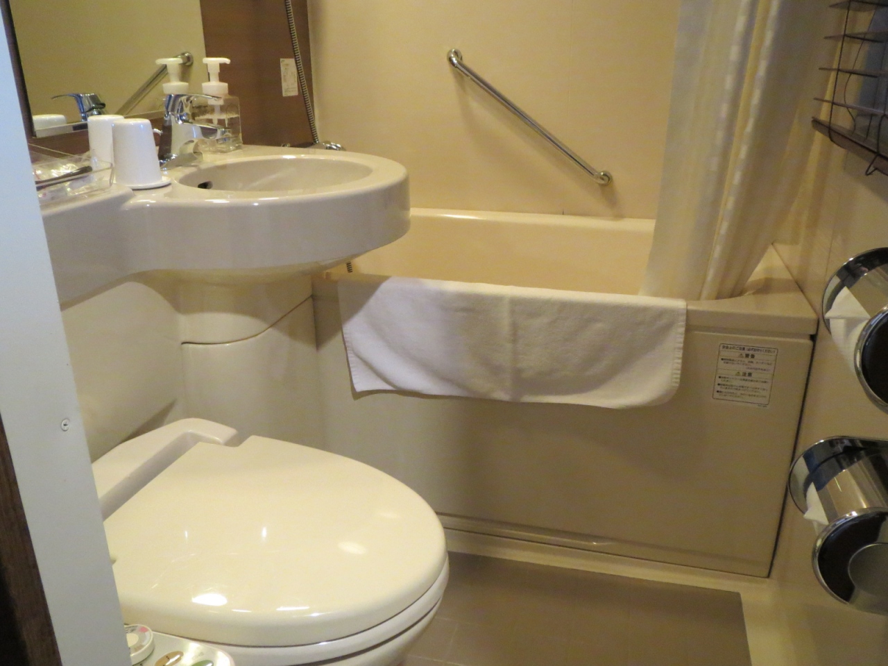 冷蔵庫の中のミネラルウオーターはサービス。パウダールームはユニット式で狭いですが、必要充分。