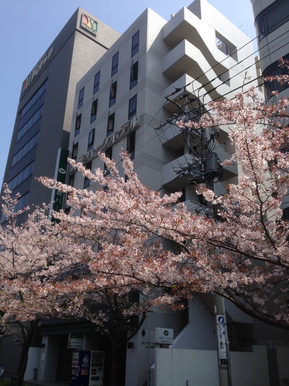 駅からホテルまでの道が車道の脇に公園が並行しているので、気持ち良く向かうことができます。建物は少々年季がはいったもので、客室も非常に狭かった。ビジネスホテルの中では小さめの部類に入る客室だと思います。窓外は公園を挟んで東海道線の線路があるので鉄道好きにはたまらない眺望かもしれません。