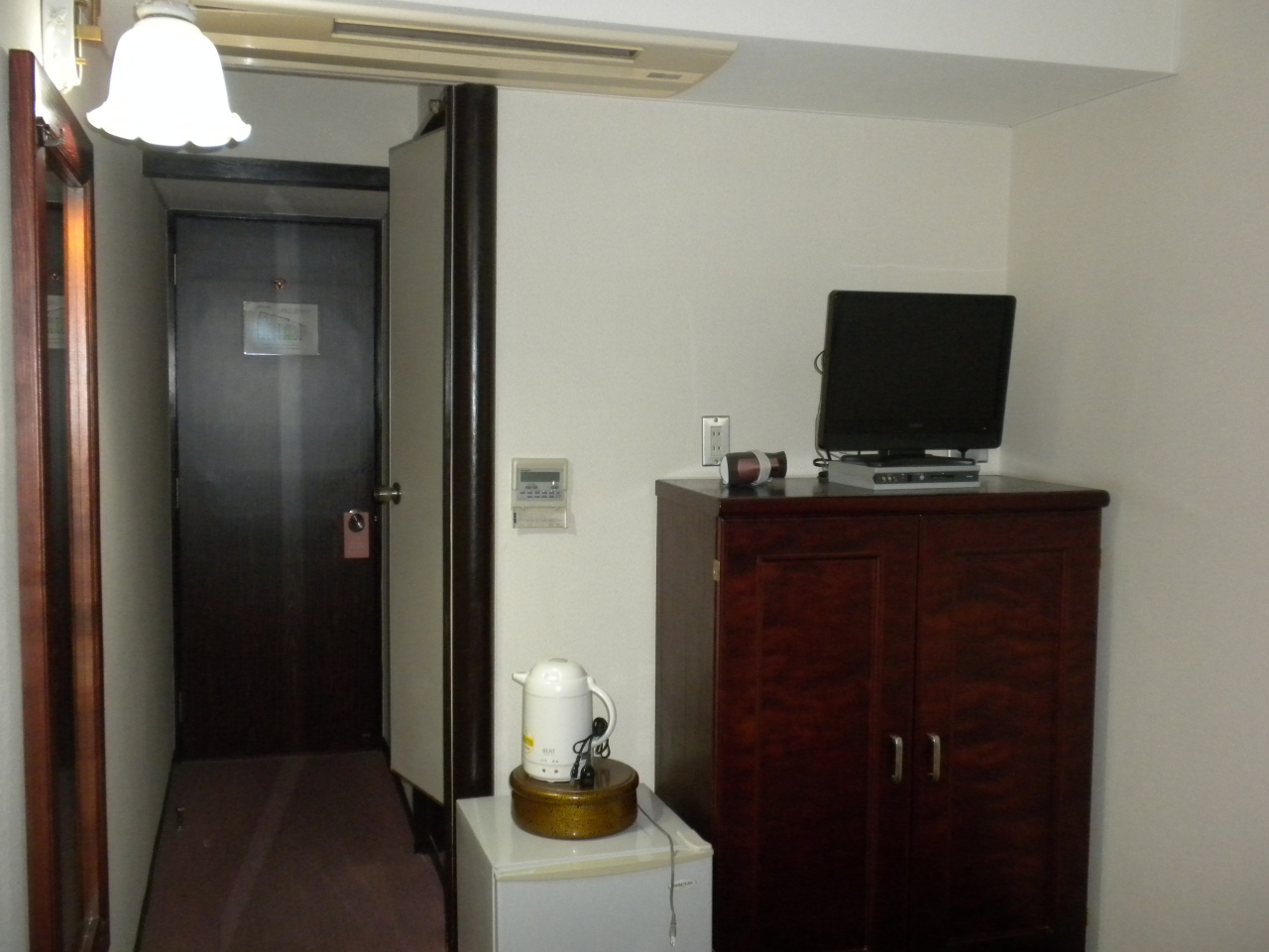 セミダブルのベッド、浴衣ではない部屋着、ポット、ドライヤー、空の冷蔵庫、テレビ、ビニールの抗菌スリッパ(私は苦手)、ハブラシが備えられています。