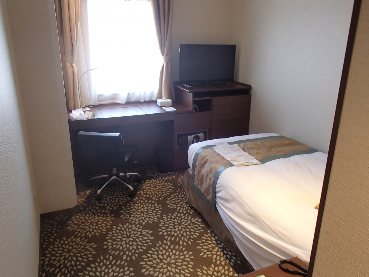今回はANAじゃらんパックでシングルで予約しました。シングルでベッド幅は100cmほどと小さ目、ユニットバスも昔のビジネスホテルレベルの小ささと古さは否めませんでしたが、日中は部屋にいることはなかったので寝るためだけなら十分だと思います。