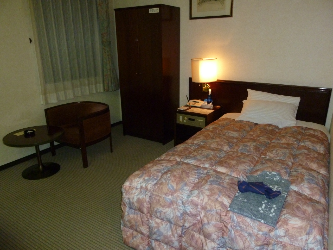 部屋:シングルの部屋に宿泊しましたが、シングルの部類では結構広かったです。地上波のチャンネルがNHKを除くと2つしかないからなのか、TVはBSデジタルが視聴できるようになっています。冷蔵庫は最初に自分で電源を「入」にしないといけません。それは冷蔵庫にも注意書きとして書かれていますが、私の場合、「入」にして様子を見ても一向に冷たくなる感じがなく、なんと電源コードが抜かれていました。宿泊される方はお気をつけください。エアコンは3段階のみで温度調節ができませんでしたが、窓が結構大きく開けられるので、エアコンは使わず窓を開けて就寝しました。都会のビジネスホテルと違い、窓を開けても圧迫感がない景色で、その点は良かったです。喫煙可の部屋でしたが、タバコの匂いなども一切なく、テーブルの灰皿を見るまで気付きませんでした。クローゼットには、高さが高めの枕がもう1つ準備されています。