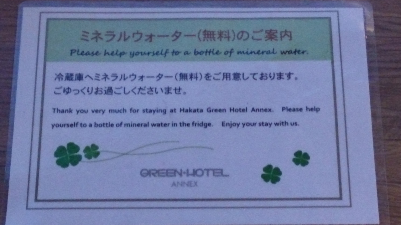 冷蔵庫にはComplimentary(無料)の水が1本入っていて、2泊したので、翌日、もう1本入っていて、有難かったです。