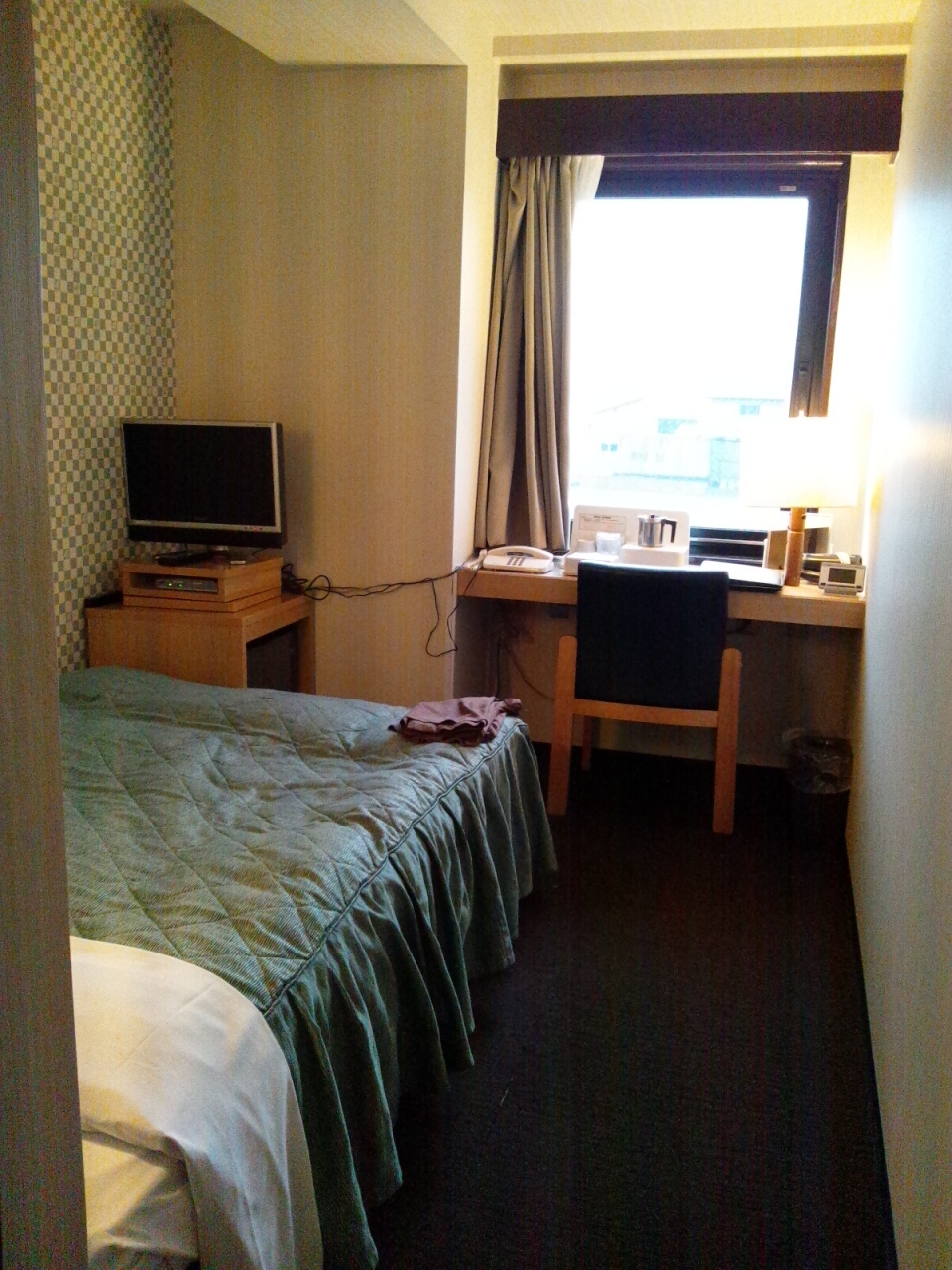 禁煙シングルの部屋は、狭くはなかったです。隣の車屋さんの向こう、雲の間に富士山も見えました。ただ、クローゼットの中が壊れていました。