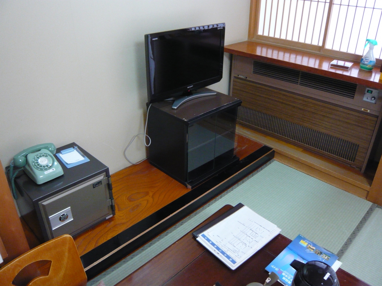 ダイヤル式の電話機に昭和の懐かしさを感じます。壁のクロスも剥がれかかっていますが、どうにか許容範囲です。部屋はきれいに清掃されています。