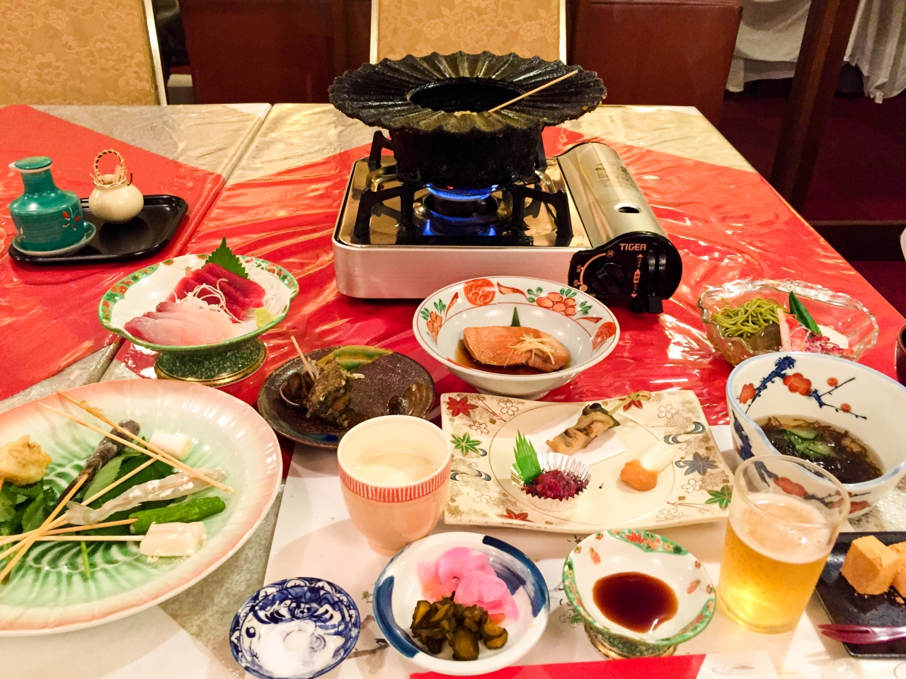 夕ごはんは名物の椿天ぷらなどなど食べきれないほどの豪華さ。