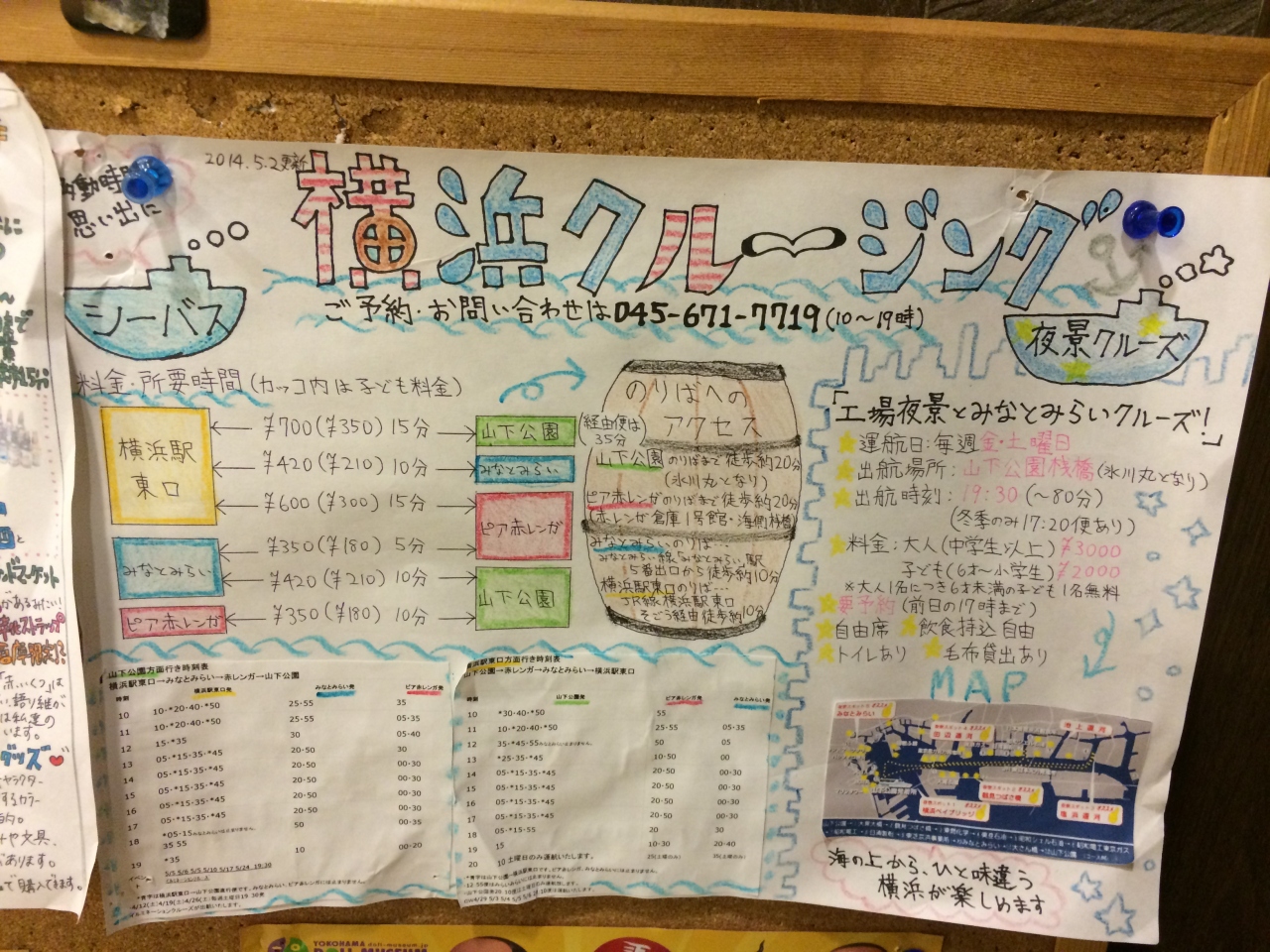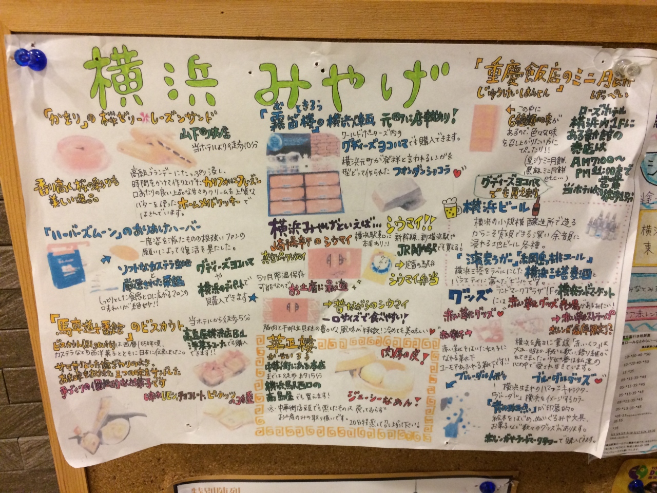 エレベーターには、手書きの観光案内やおすすめのお土産の案内があり、とても参考になりました。時間を見つけて、中華街や赤レンガへ行ったり、おすすめのお土産を探して買いに行きました。