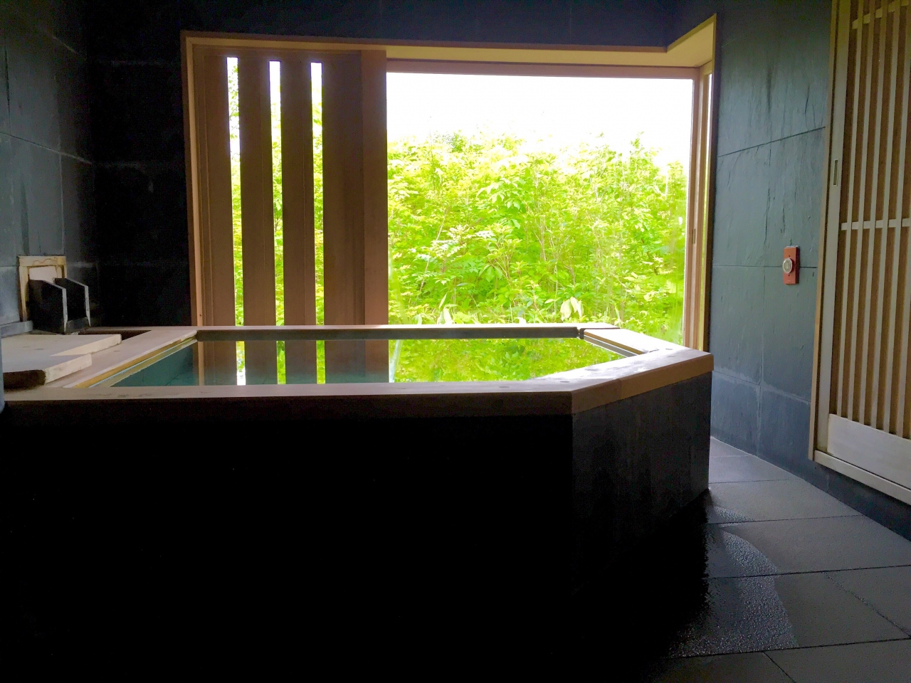 館内のしつらえも素晴らしく、客室の半露天、大きなガラス窓から見える新緑は圧巻です。