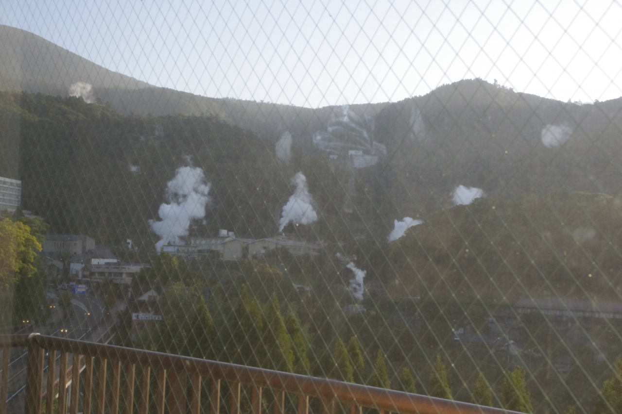霧島温泉郷に建つホテル。外の風景に目をやると、複数箇所から蒸気が立ち上り、温泉郷の雰囲気が溢れる。
