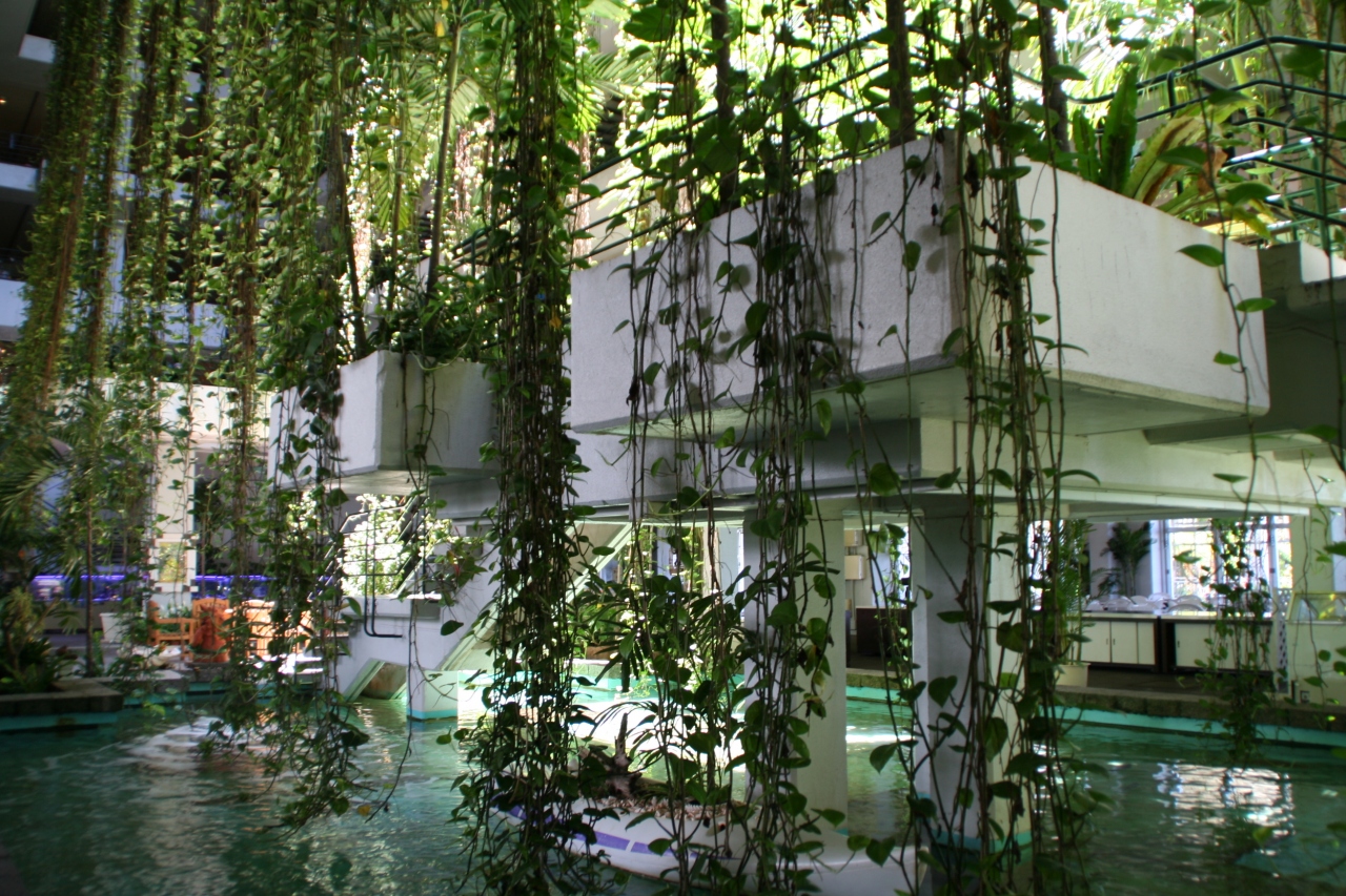 ホテルの建物は吹き抜けになっていて、熱帯の植物がロビーの広間に滝のように流れています。
