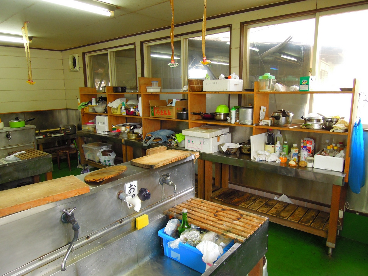 後生掛温泉は湯治をしている人がたくさんいて、みんな食材を持ち込み、また山で採ってきて、楽しそうに調理しています。冷蔵庫はなく、山の冷たい水がかけ流されてる桶があるので、そこにぶらさげておきます。それか、クーラーボックスの場合はフロントに言うと保冷剤を借りられます(有料)。
