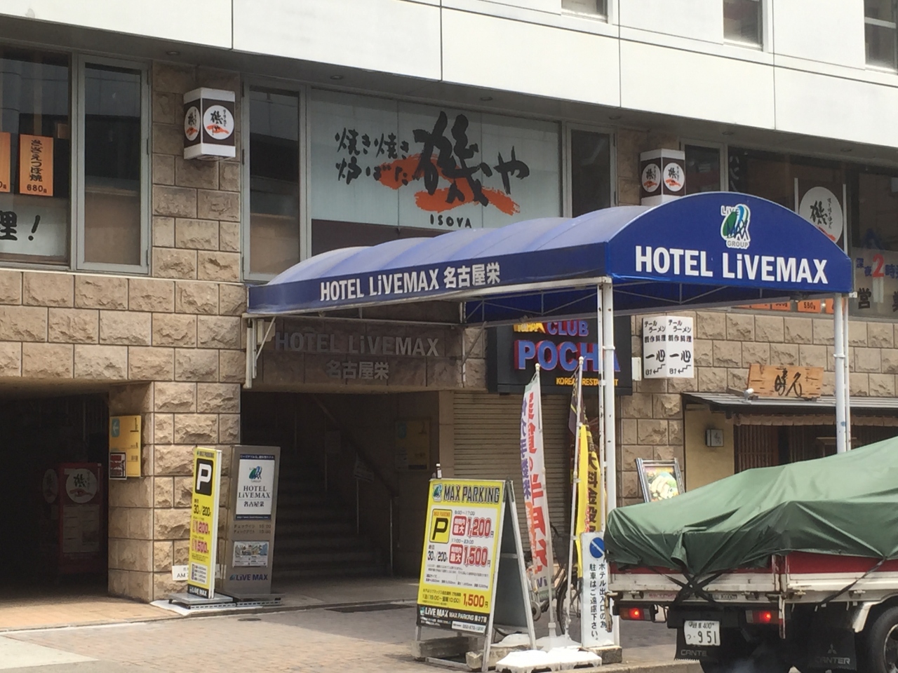 ホテル建物の1階2階が飲み屋がたくさん入っているのぼりや看板が多いのでやや落ち着かない感じがします。ただ繁華街中心ではないので夜でも眠れない事はなさそうです。場所は栄駅から徒歩数分圏内なので立地はかなり良いです。
