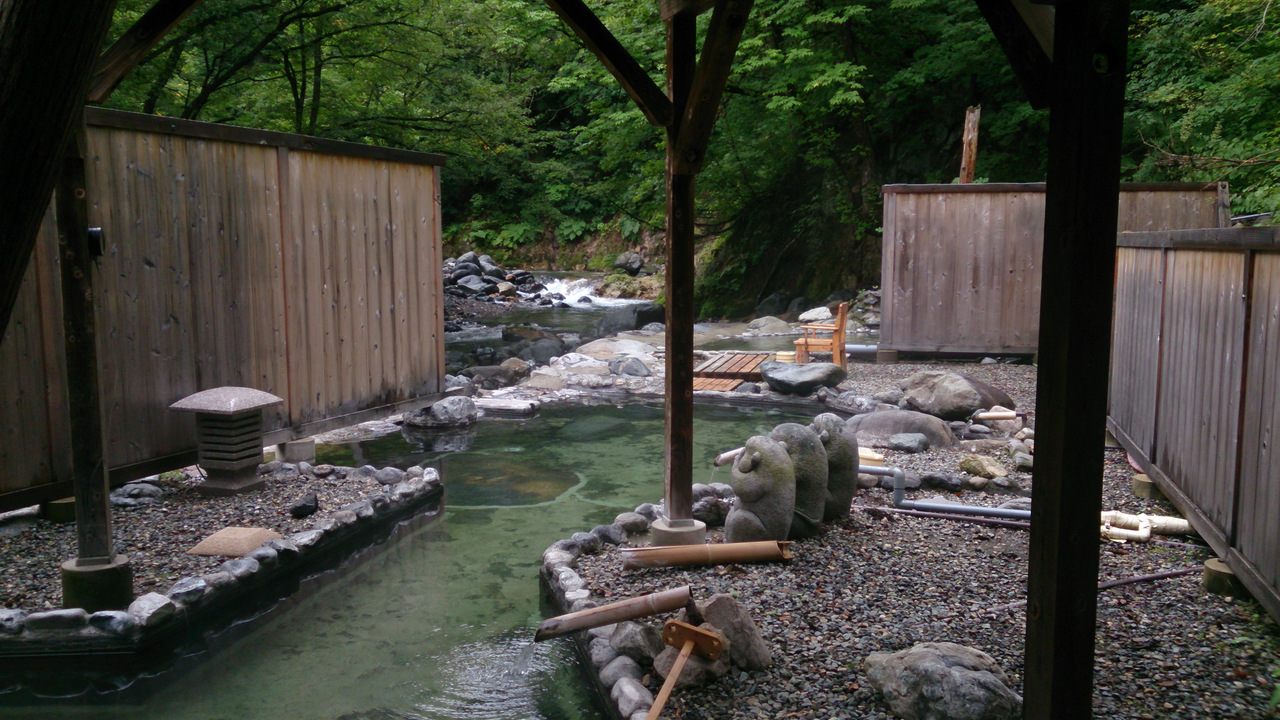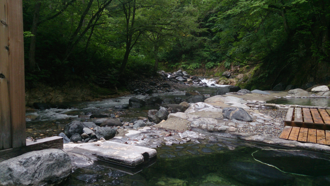 小さいのから、普通のホテルの露天風呂以上の大きさのものまで揃っており、川沿いにある為風呂から川が見られるところも。