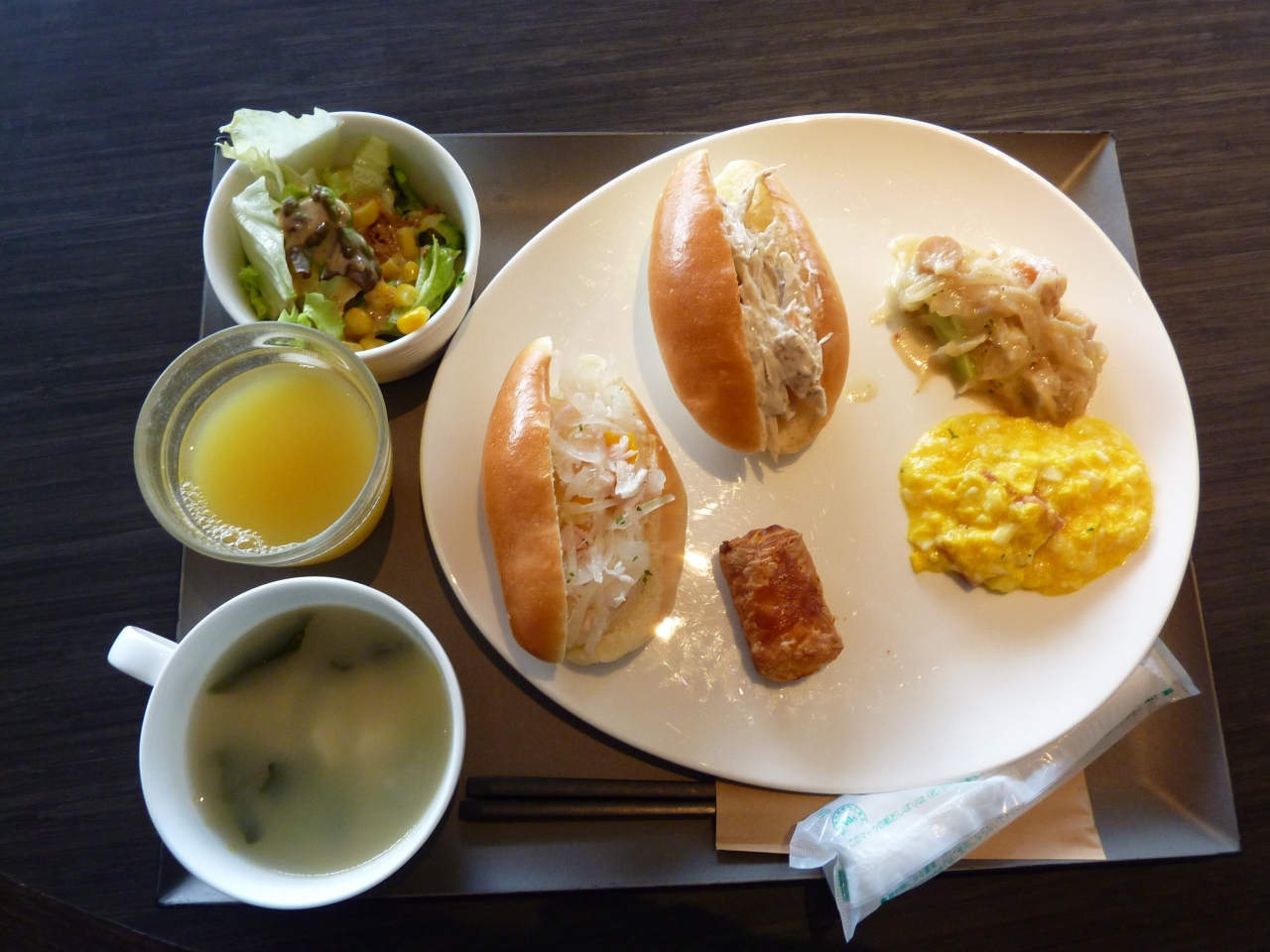 ユイレール旭橋駅から歩道橋を歩き、地上に降りることなくホテルに入れます。4階にフロントがあり、奥が朝食会場になっていました。1階の出入り口は夜間は施錠されるので、3階から出入りすることになります。