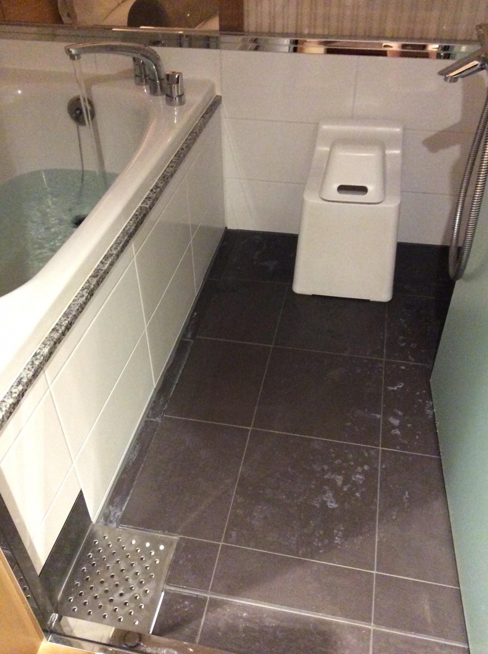 せっかくのセパレートバスルームのタイル床は、カルキ跡がバッチリ。