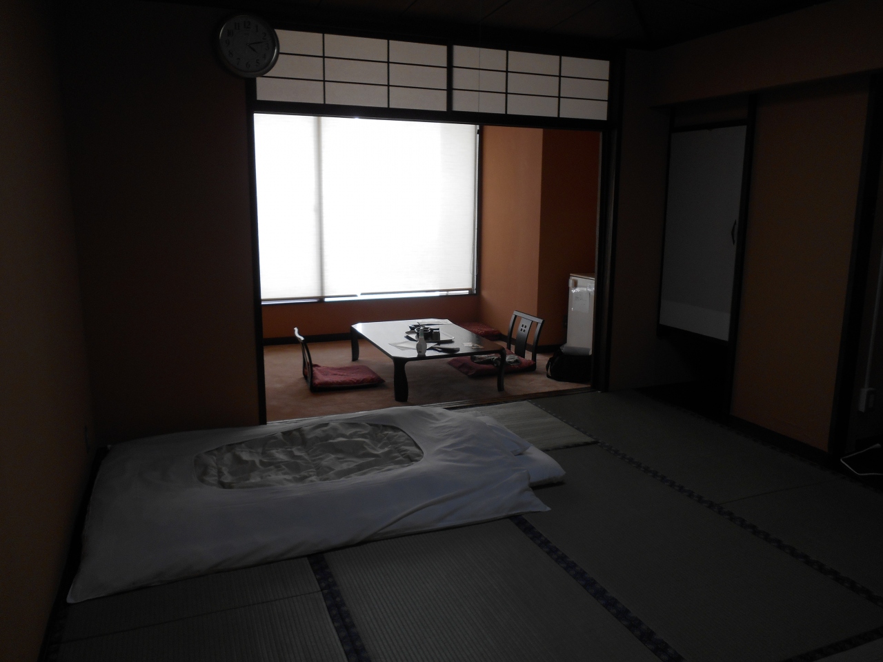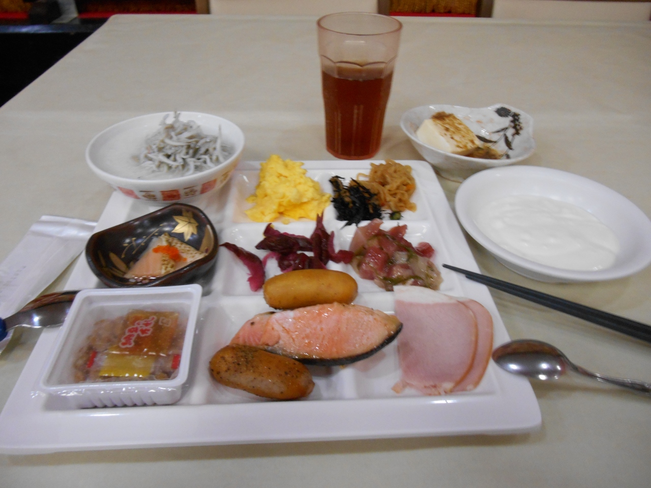 ふるさとクーポンを利用して宿はしたので2食バイキングで温泉に入って1泊6000円以内は満足。部屋もシングル洋室から和室に変更され、広さも十分で、部屋に着くと布団が用意されており結構良かった。ただ景色はホテルの寮になるのでカーテンはしたまま。