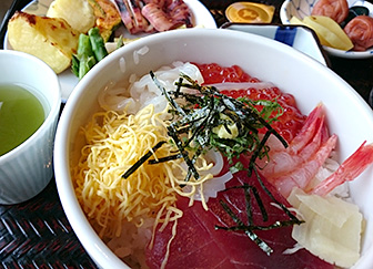 北海道ならではの「セルフ海鮮丼」コーナー、好きな具材で海鮮丼が作れ、食べ放題です。