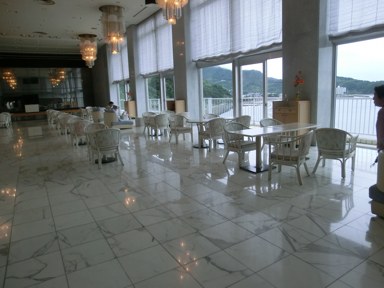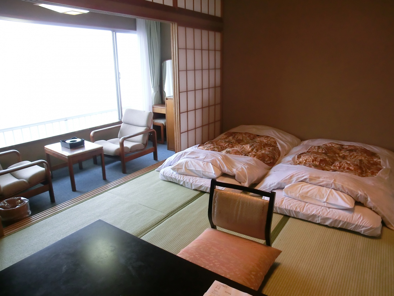 伊東園3回目の利用です。前2回が部屋がよくなかったり、掃除が汚かったりしたので期待しないで行きました。ところが部屋に入ったとたん「うわぁー!」全面海です。12畳に広縁付きの広い部屋に二人でした。窓は桟がなく一面ガラス張り。これだけで満足しました。お掃除もきちんとしてありました。お風呂もラウンジも目の前に海が広がりとてもよかったです。食事はテーブルとの間が狭いのでゆったりとした感じではありません。メニューは私としては十分でした。従業員の方たちも感じのよい人ばかりでした。