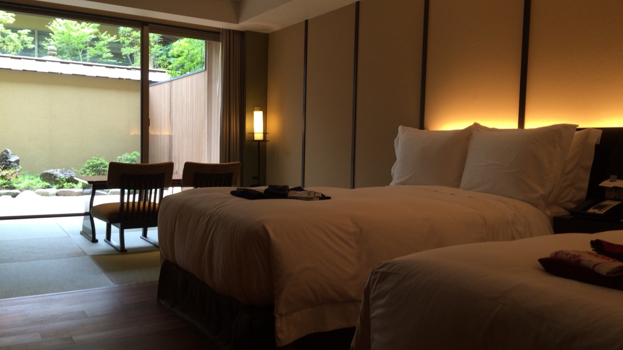 客室はデラックスタイプで部屋風呂は露天で温泉タイプ。専用の庭もあり、壁に囲まれてはいるが雰囲気は悪くない。寝室も広くはないが、寝心地の良いベッドで快適。ウェスティンのヘブンリーベッドのような寝心地で熟睡できた。只、露天風呂は宿の周囲が静か過ぎるため、小声でしゃべらないと隣近所によく響く。虫の音が聞こえ風情はあるが。