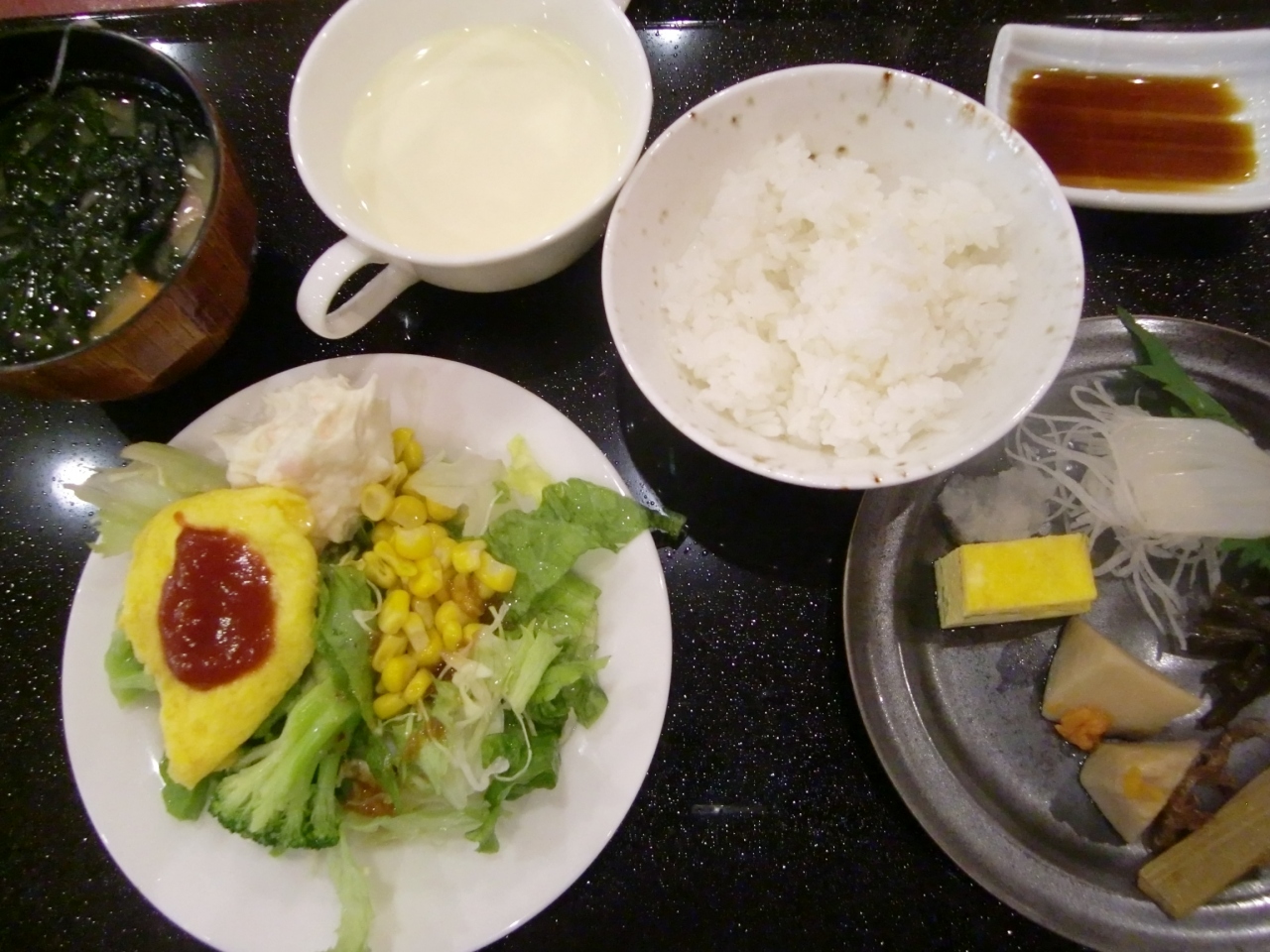 (今回は数種の美味しい佃煮でした)いか刺しなど
