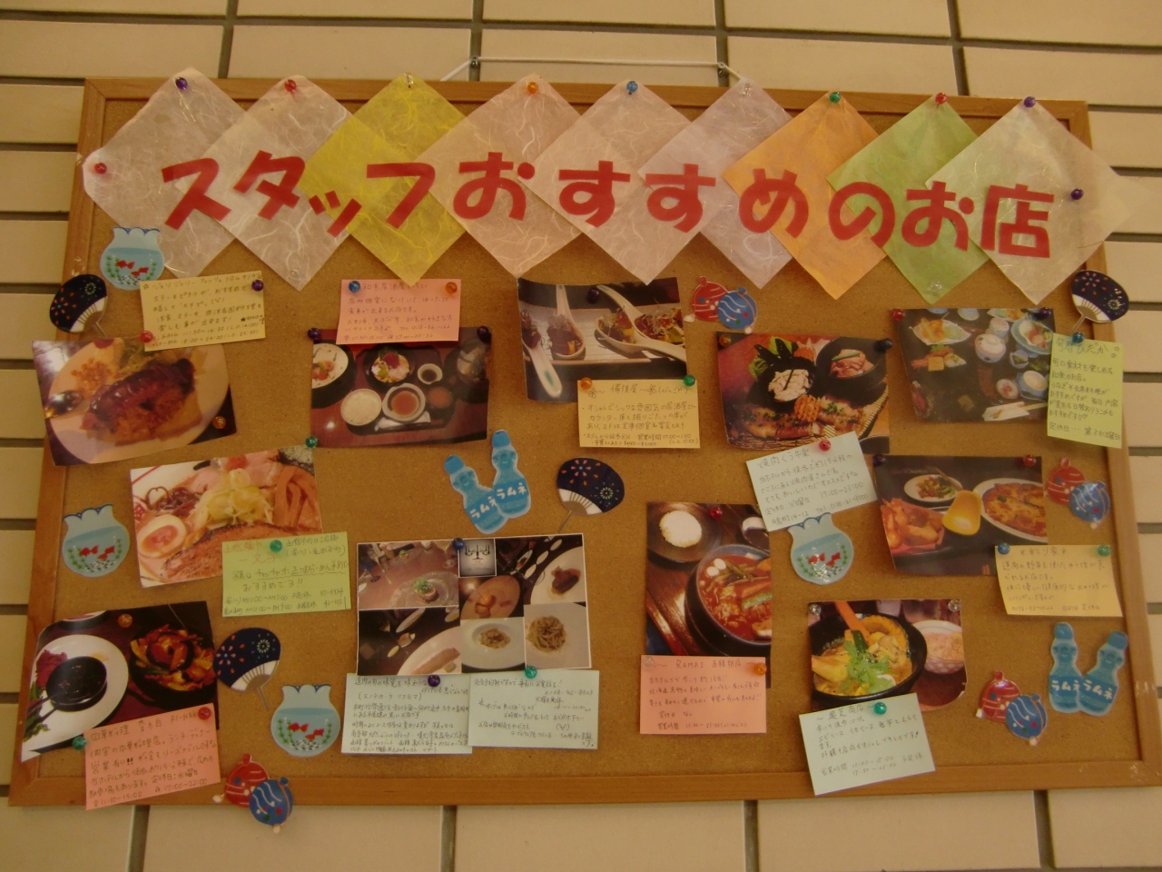 ロビーに掲示している手作りの近隣のグルメ紹介も
