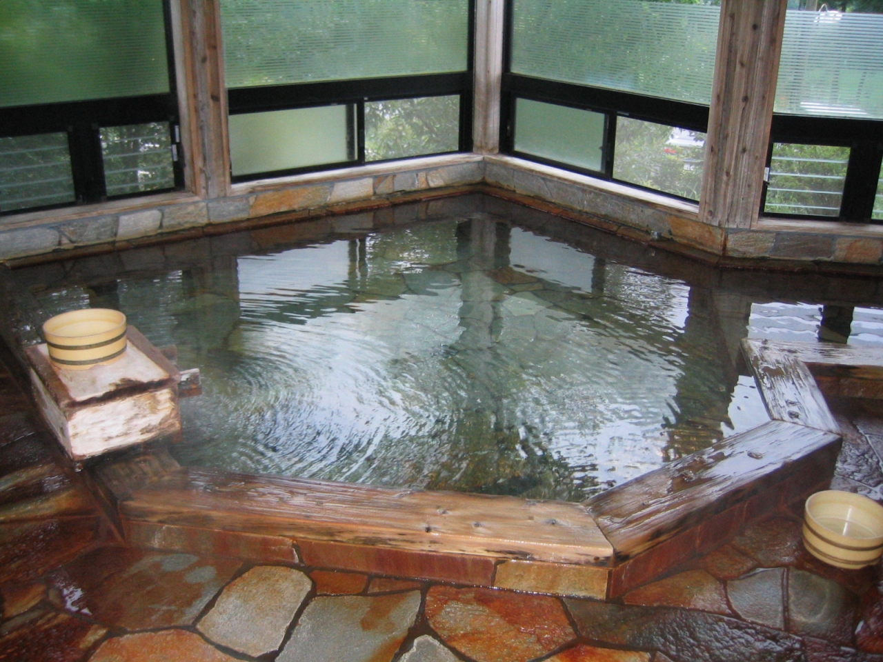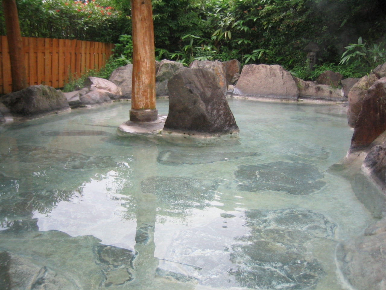まずお風呂は内湯(黒い湯の花が浮く珍しいお湯です。もちろんいいお湯です)、大きな露天、さらに貸し切りの家族風呂などがあり、全部回りきれないほど。