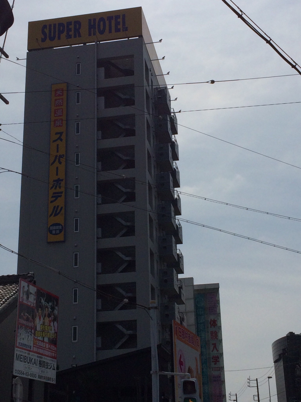 岡崎のスーパーホテルは、国道1号線を安城方面から来ると黄色い看板が目印、左側にあります。