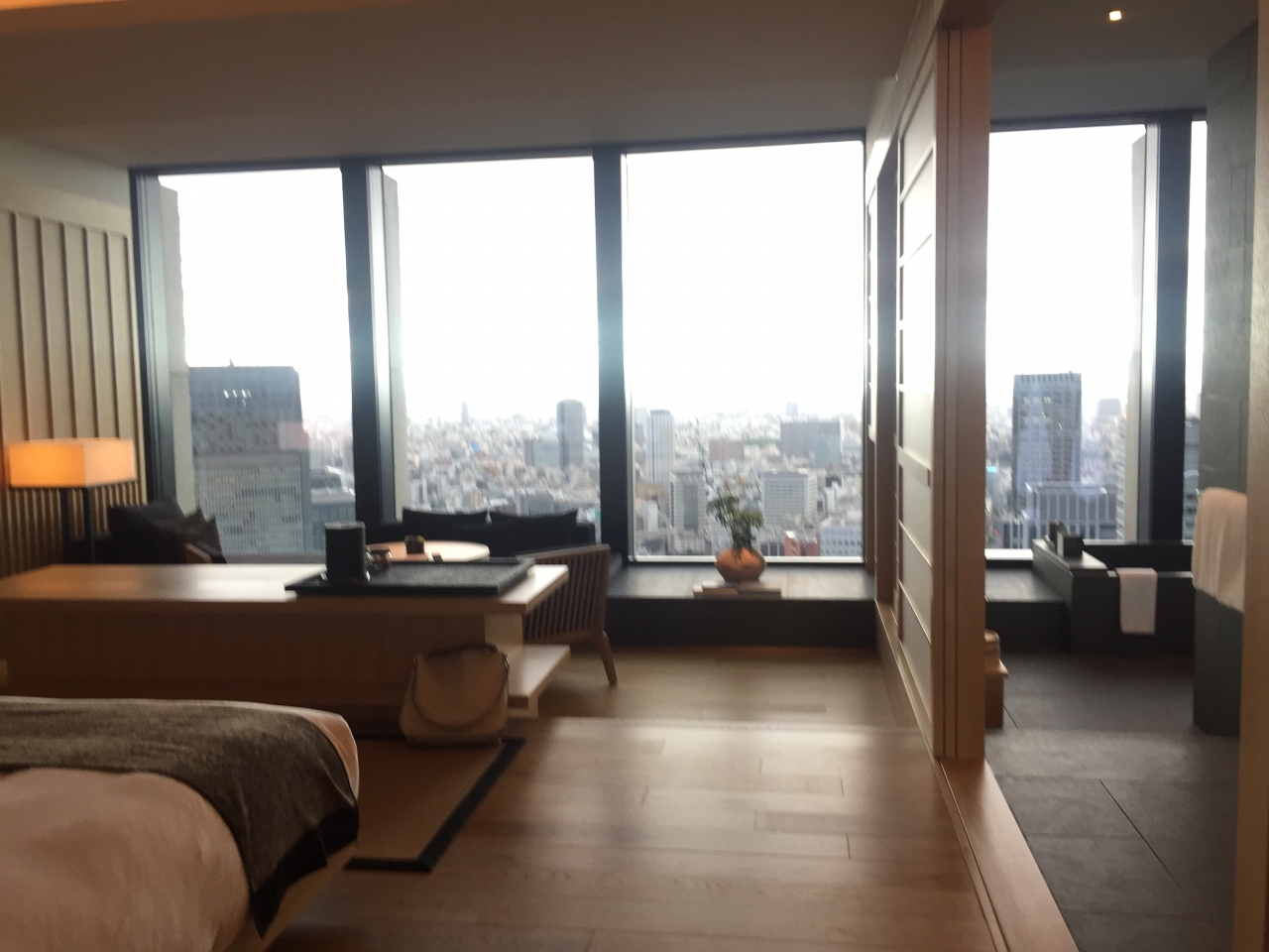 東京のラグジュアリーホテルはほぼすべて泊まっているが、その中でも「空間をゆったりとつかう、という意味での贅沢さ」はピカイチ。スタンダードで70?の広さ、そして窓際の天井高さはおそらく都内最大。今回はアメックスで予約したので、室数の少ない「プレミア」に。80?で、スタンダードとスイートのあいだの位置づけ。