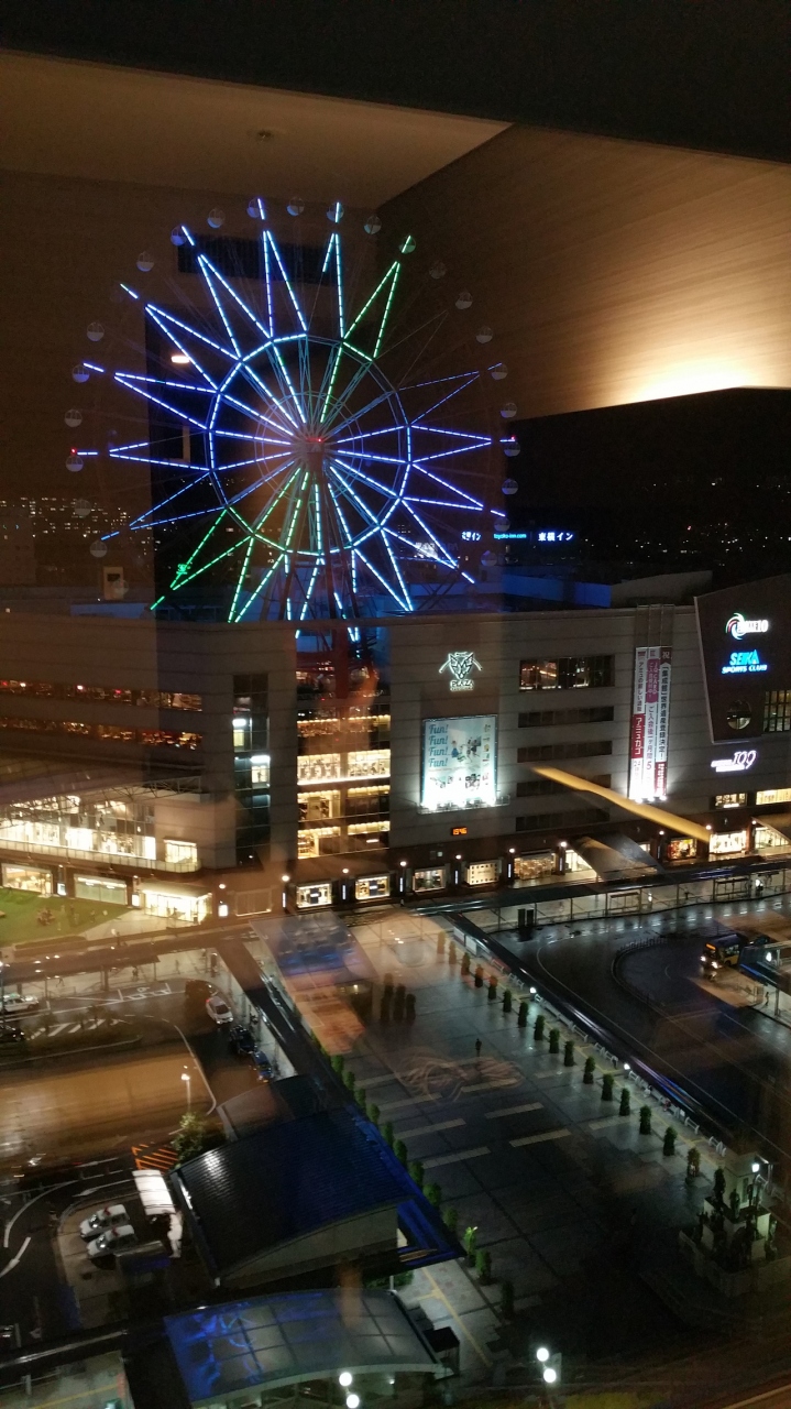 部屋からの景色は、目の前にアミュプラザ(JR九州の商業施設)の観覧車が。夜はとてもきれいでした。