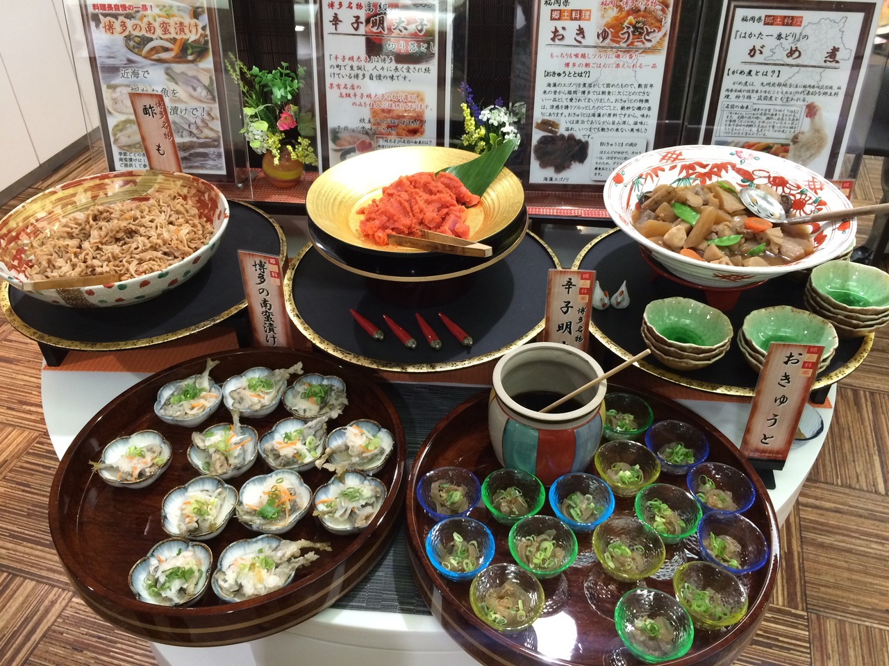 また朝食はバイキングになっており、明太子はもちろん「おきゅうと」や「がめ煮」(筑前煮のこと)など福岡の味覚も豊富に楽しめますよ。