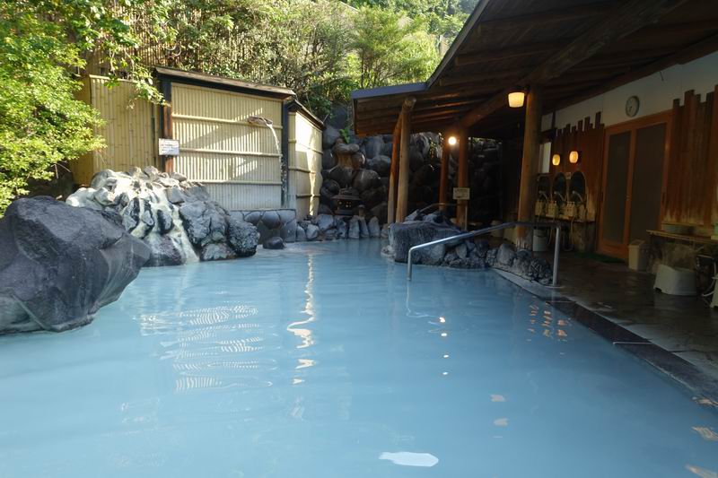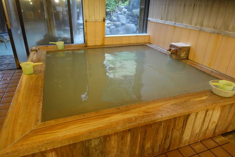 本館に男女1か所ずつ、別館にも男女1か所ずつで、それぞれに露天風呂があります。入浴時間は午前11時~夜24時、朝5時~9時で、朝5時に男女入れ替わり。なので1泊すれば本館と別館すべてのお風呂に入れます。個人的には別館のお風呂のほうがおすすめなんですが、別館は長い通路を歩くことになり遠いので、足の悪い人にはちょっと厳しいかもしれません。本館大浴場の露天には泥パックのコーナーと蒸し湯もあります。白濁の硫黄泉を堪能できました(本館の内風呂と露天の一部浴槽は透明のお湯です)。