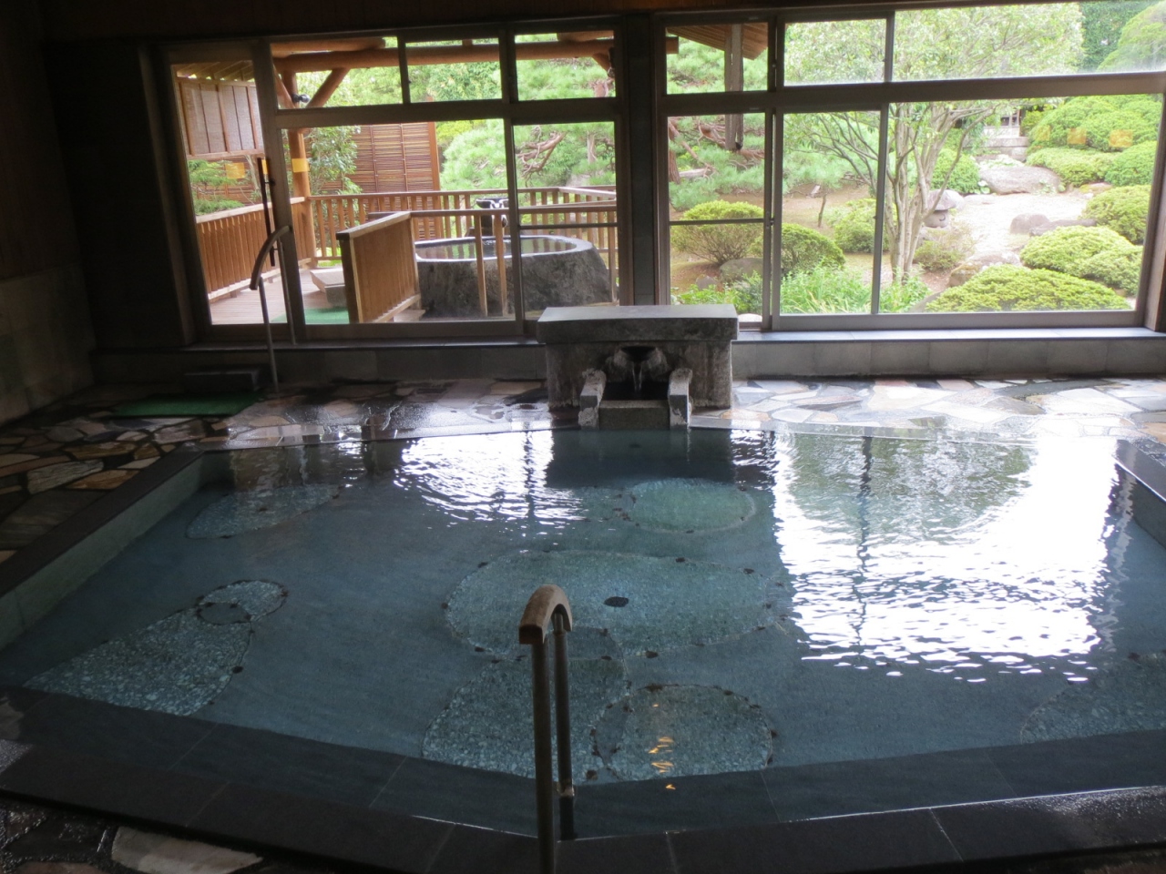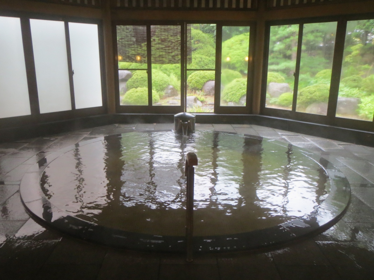 数寄屋造り、全12室の高級宿です。「山形日和クーポン」利用して源泉掛け流しの部屋風呂付きに泊まりました。大浴場の内湯、露天から見える中庭も素晴らしく、お湯はくせのない含石膏-芒硝泉です。