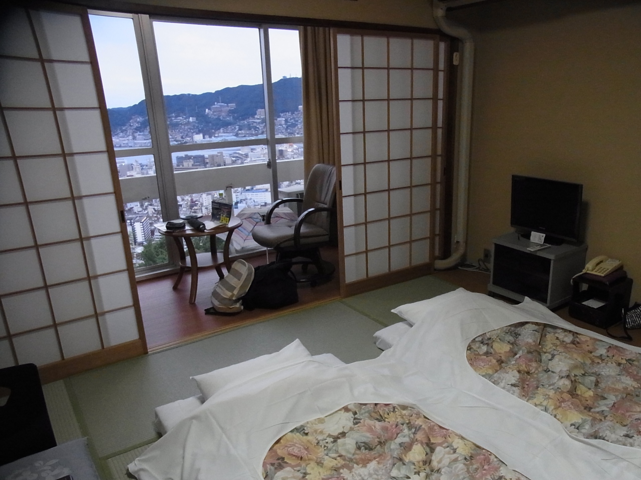 この旅館は山の頂上にありました。ホテルの前は大きな駐車場となっていて、正面から観ると本館があり南館は左側が入口です。山の斜面を利用して建設された関係で、ロビーは建物の中間にあります。南館が本格的なロビーでしょう。ロビーから観る夜景は最高でした。そのロビーの奥には大きな売店で、長崎の名物が沢山置いてありました。さて、泊まった部屋は本館でした。10畳敷きの和室で、そこからは長崎の港が一望出来る素晴らしい眺めで、夜景は又見事でした。お風呂も本館にも沢山有り、又、南館のお風呂も大きくて快適です。この矢太樓の旅館の近くには風頭公園があって、坂本龍馬の立像が威風堂々と立っていました。更には、この公園の中には亀山社中の跡地も観ることが出来ます。