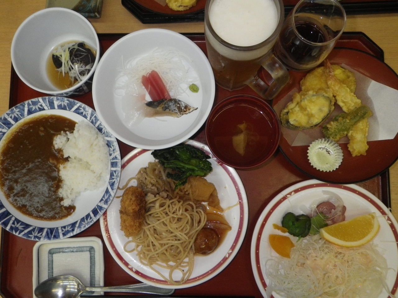 ?朝夕共ビュッフェタイプ。(夕食時は、ビール・日本酒・ワイン・ジュースなども飲み放題。夕食のみ、3品があらかじテーブルにセットされているが、他のメニューは自由)