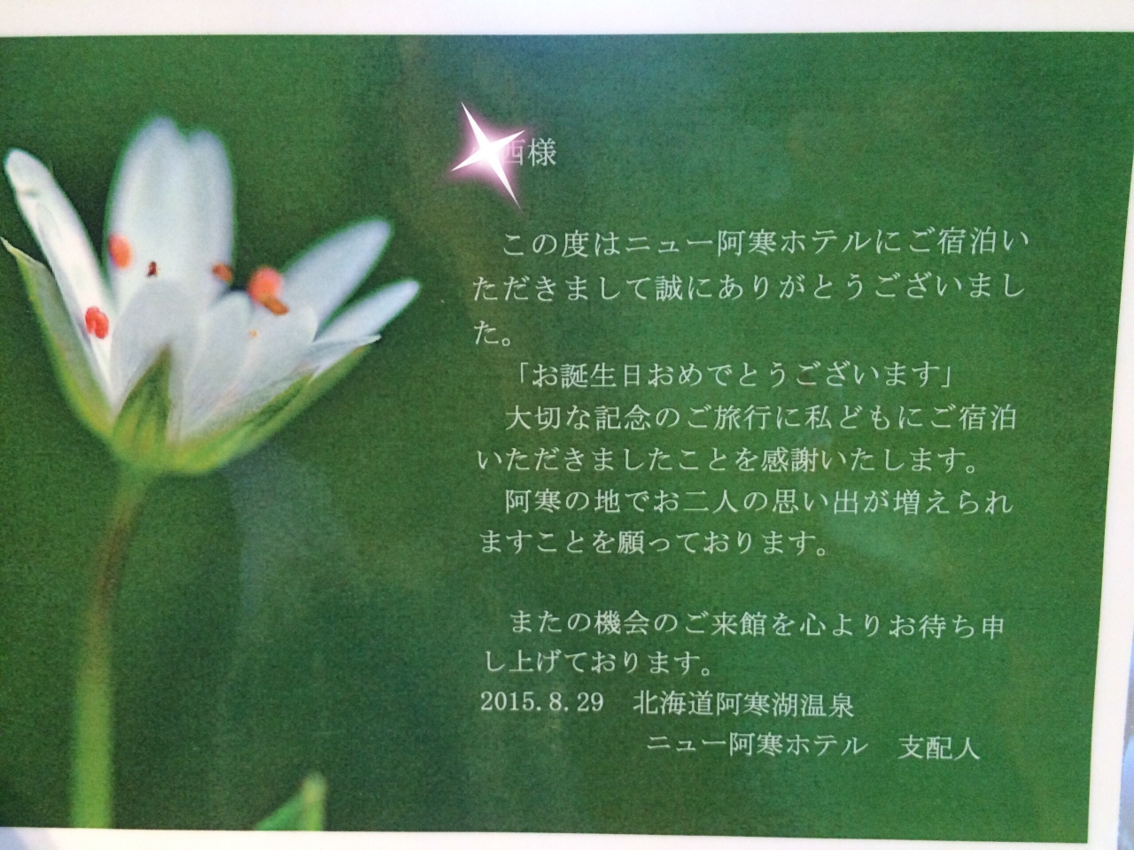 予約時に誕生日だと伝えると、素敵な部屋を準備してくださり、部屋にはお祝いのメッセージカードも添えられていました。