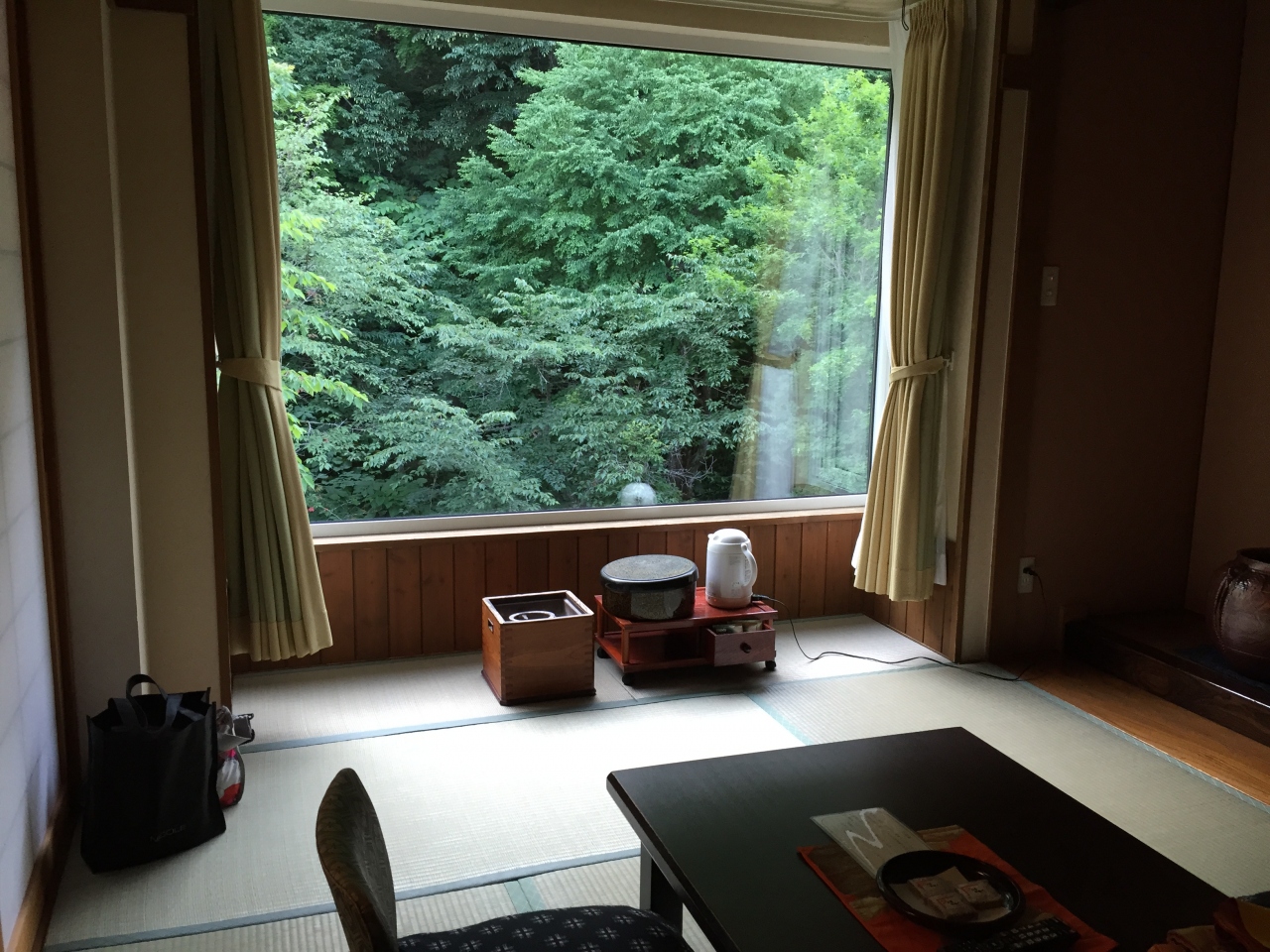 お部屋は川沿いの和洋室でした。窓の外の景色が額縁にはめられたように新緑が美しく眺められ、素敵なお部屋でした。